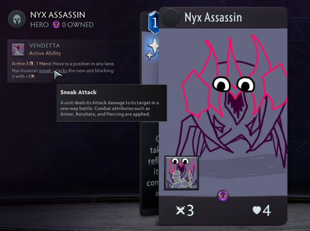 【复仇】主动技能,3回合领取额,1魔力:移动到任意兵线上的一个位置。司夜刺客临时+3攻击并偷袭阻挡其前的单位。