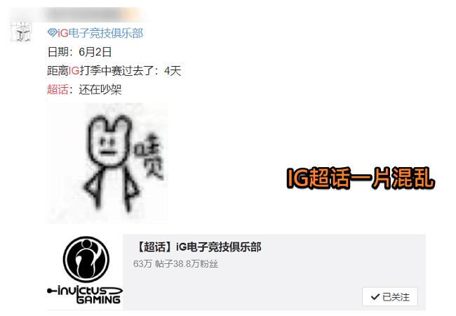 IG官博底下还出现了一种不一样的质疑声,自从季中杯失利之后,IG的超话就出现了各种各样带选手节奏的帖子,对选手是各种谩骂和质疑,甚至是恶言相对,导致超话里面是一片混乱,粉丝们也是看着就觉得很生气,另一部分因为发表激进的帖子而遭到删帖的粉丝则是不满意超话主持人的这种做法,认为选手没打好比赛就应该被骂,他们应该承受那些批评和谩骂的帖子,删帖的行为只有饭圈才会做的,在电竞场上输了就该被喷,所以IG的粉丝现在是形成了两派,矛盾也是愈演愈烈。