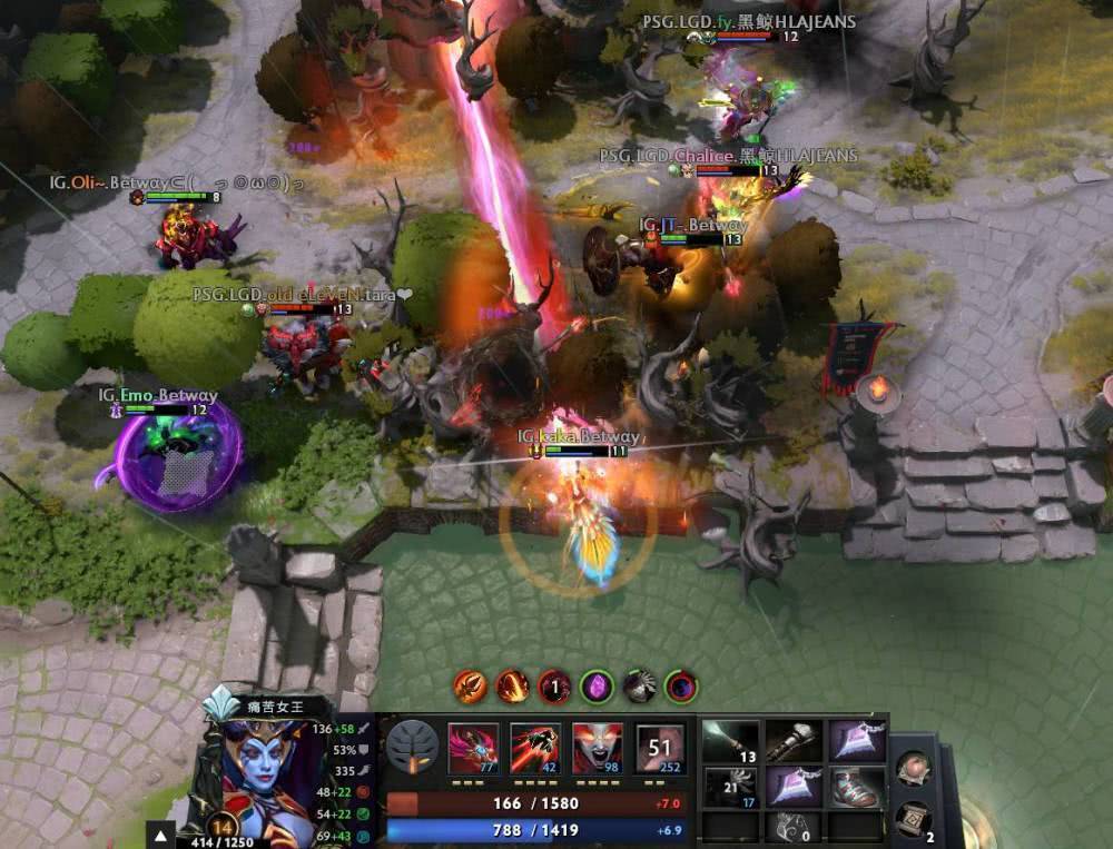BO3的第一把,IG一上来就点出了凤凰马尔斯的组合技。另一边,LGD则是在Ban掉龙骑士后将女王收入囊中。其他位置上,IG还拿出了Emo的中单紫猫和zhizhizhi的水人,以及卡师傅的凤凰。LGD则是点了查理斯的小狗、老11的人马,酱油是拉比克和神谕。对线期,LGD在中路和下路先后斩获人头,但因为水人的补刀实在很多,双方并没有拉开经济差距。