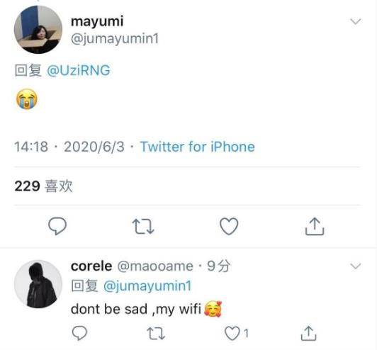 远在海外的Mayumi,也是深受LPL观众的喜爱,她也在推特上回复UZI,回了一个哭泣的表情,当然下面评论区也有LPL观众在安慰mayumi。