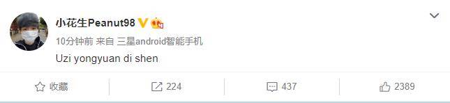 Peanut也在收到这个消息后,在微博上用拼音表示:UZI永远滴神!看来这个梗,小花生现在已经非常熟悉了,估计是中文不太好,只能用这种简单的方式表达自己的想法和心情了。