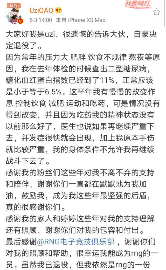 Uzi在自己的长文动态中说到,自己之所以会选择退役,伤病是一个重要原因。在从事电竞职业选手的过程中,跟其他电竞选手一样,Uzi也存在作息不规律、熬夜等对不好的生活习惯,但有时候为了让自己的战队取得更好的成绩,自己不得不做出一些牺牲,时间一长,Uzi不仅手部受了伤,而且还得了糖尿病。面对自己的身体状况,Uzi必须要做出选择,在了解了这一条信息后,不论是从Uzi的个人角度还是观众的角度来说,Uzi这个时候应该退役,因为相比于电竞成绩,身体的健康才是头等大事。