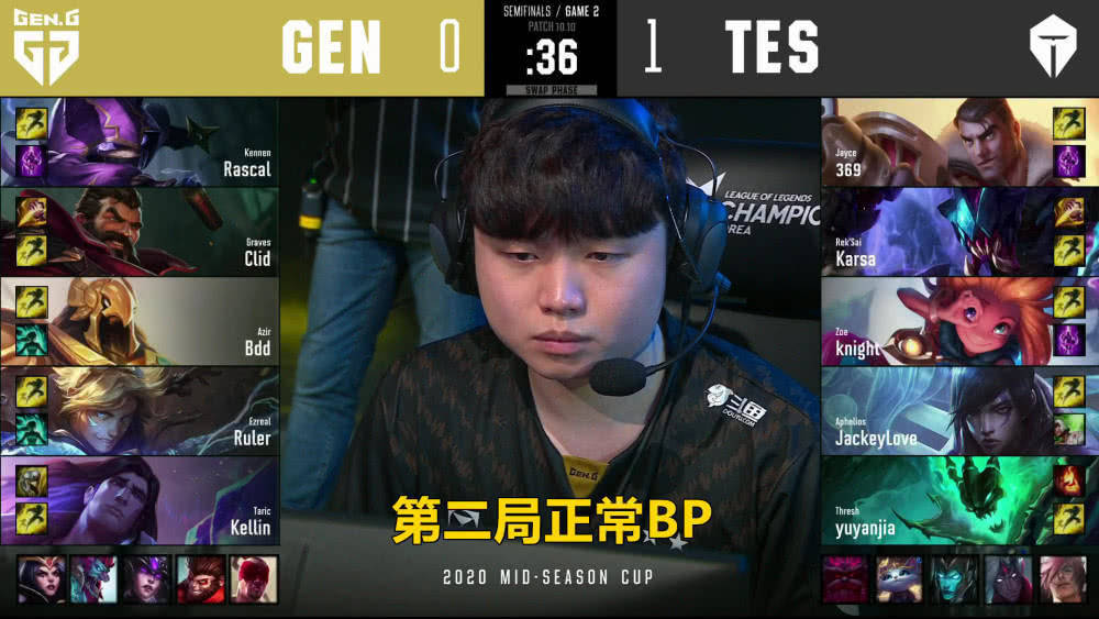 GEN战队:上单Rascal凯南、打野Clid男枪、中单BDD沙皇、下路Ruler伊泽、辅助Kellin宝石。