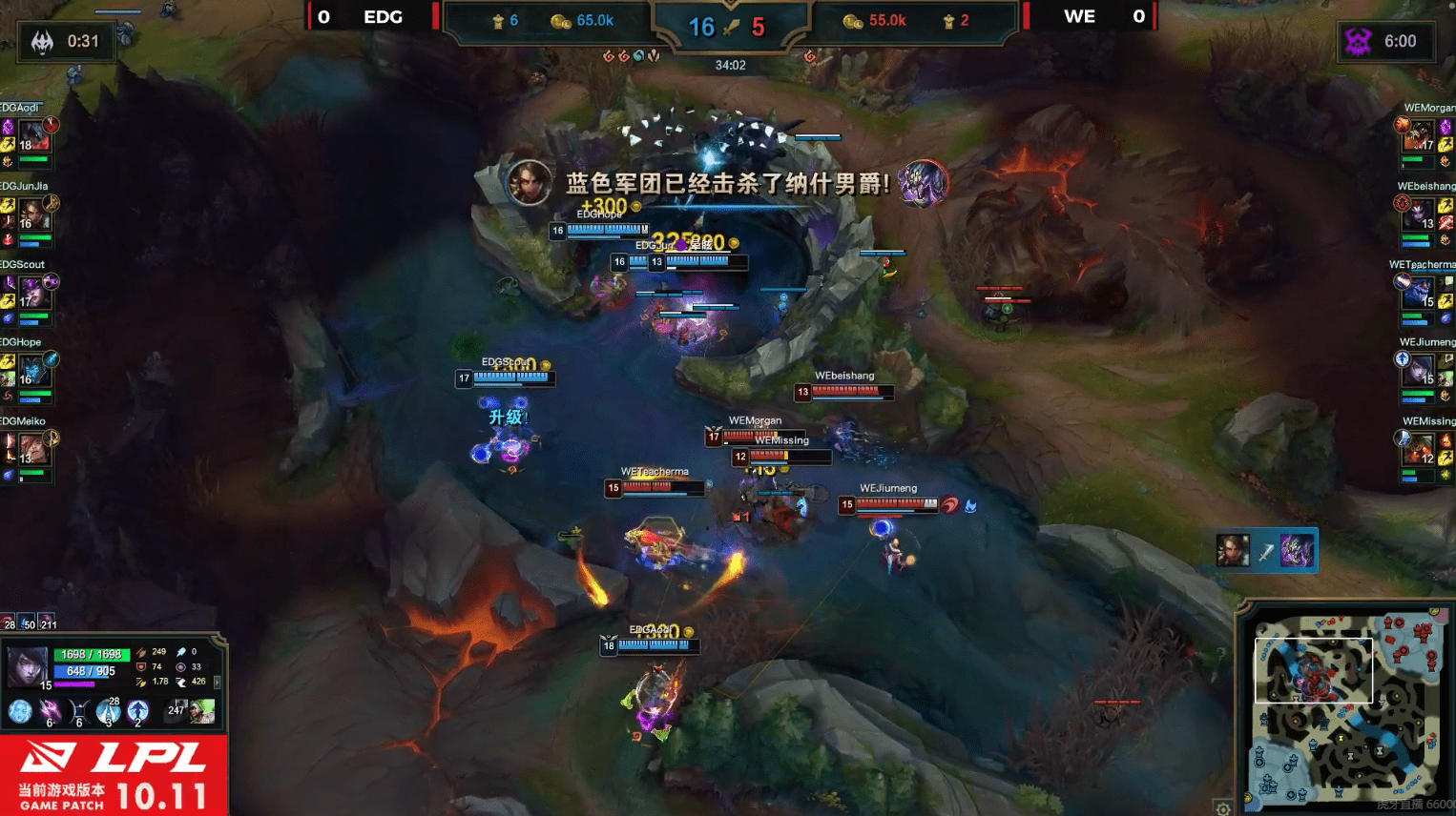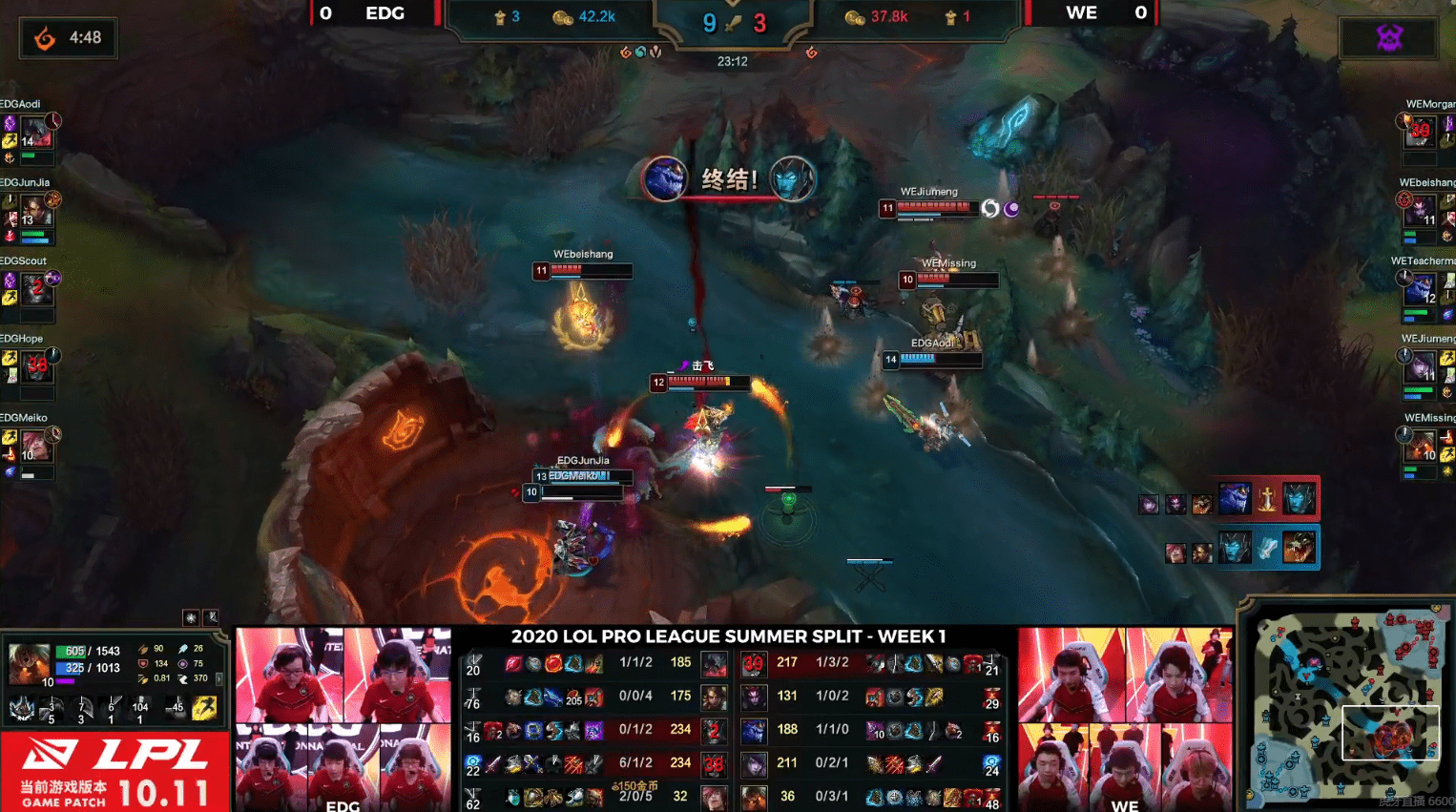 下路对线崩盘后WE选择了提前换线帮忙控峡谷先锋,借助先锋拿到了一血塔,但下路对线仍旧没法打,加上对线期提前结束,让马老师龙王也没能游走起来,EDG轻松控到了前期三条小龙,关键的龙魂团前,scout辛德拉被morgan鳄鱼草丛埋伏破盾配合队友完成击杀,随后又是打残了hope卡莉丝塔,马老师龙王大招加闪现成功收下了终结人头,让WE赢下了关键团控到了火龙!