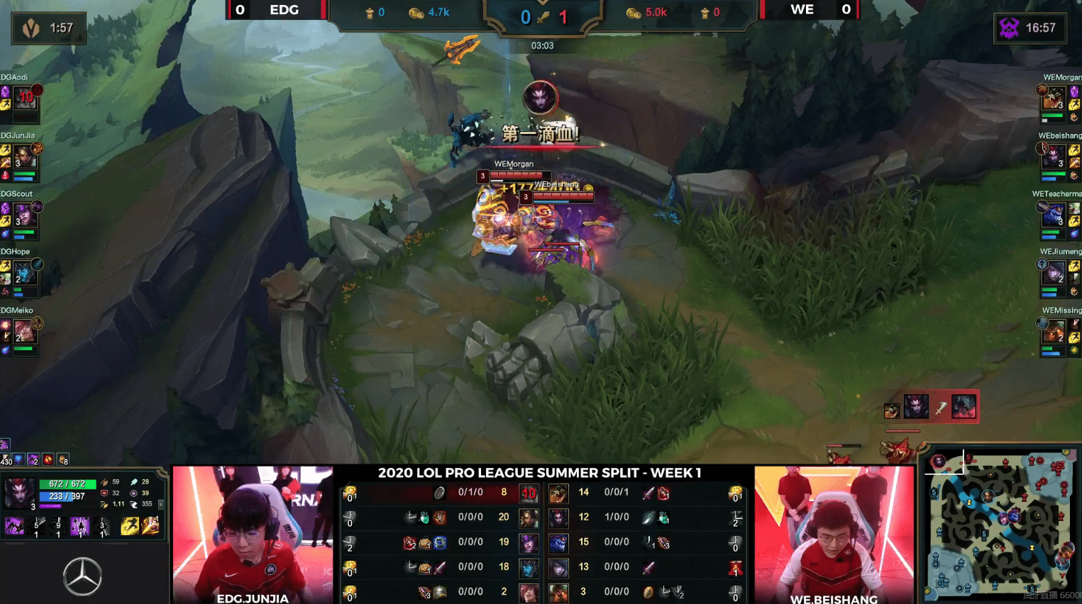6月5日LPL夏季赛正式打响,揭幕战由EDG对战WE,首局EDG将马老师两个招牌能飞的英雄都送上了ban位,拿到了强势的下路双人组卡莉丝塔腕豪,而WE则是强势上野动物园组合,马老师拿到招牌龙王。