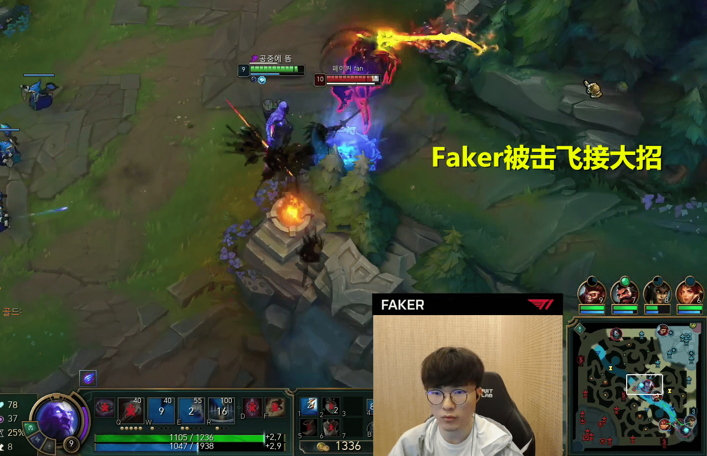 Faker走位不小心没能躲掉这个Q技能,被击飞之后当即被亚索接上了大招,这一波伤害瞬间打掉了Faker一半的血量,而且Faker还被挂了点燃,此时的情况非常不妙,Faker就赶紧逃跑。