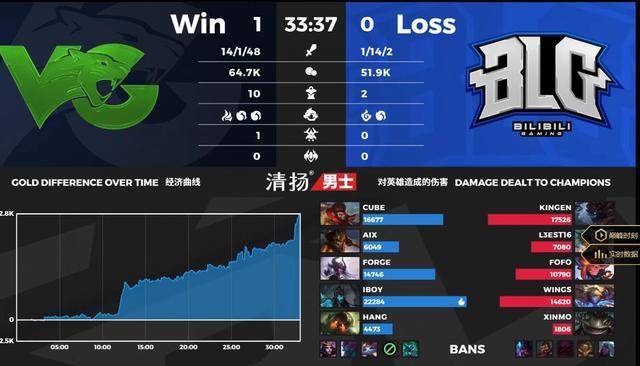 这第一局Kkmoa似乎还谦让着BLG战队,在BP阶段直接空ban,似乎对这局已经胜券在握,不需要ban英雄了!这是很自信的表现!空ban也说明VG已经拿到了自己拿手的阵容,不需要再ban英雄了!在这局比赛中,VG的选手们也用实力诠释了空ban的道理,最后以14-1的战绩获得了胜利!整局全面碾压!没有给到BLG任何机会。
