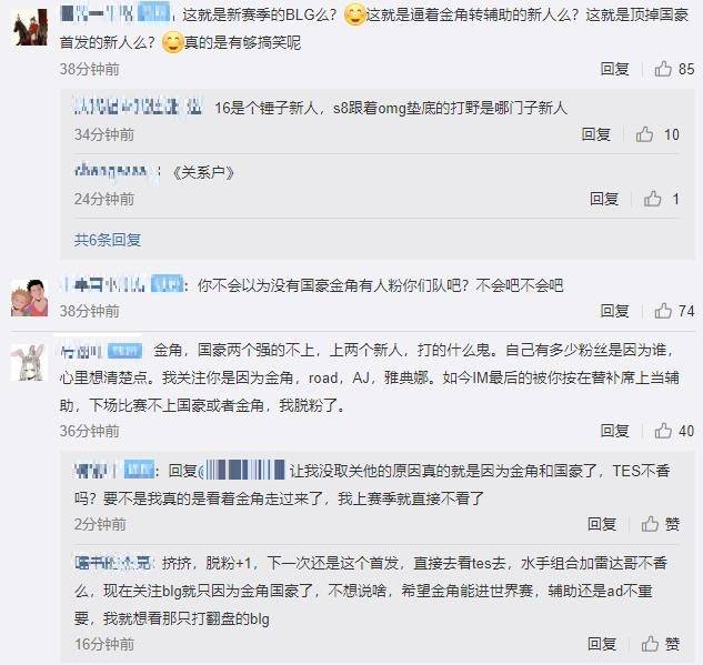 在BLG官博发布的赛后失败的官博下方评论区,很多网友都在怒喷BLG。怒喷的主要原因就是国豪和金角没有上场,并且顶替他们首发的新人都表现不佳。不少粉丝直言:逼着金角转辅助,让国豪也替补了,你们不会真的以为没有国豪和金角,还会有人支持你们吧?两个最强的选手不上,让新人上场,到底是什么意思?下一场再不上国豪和金角,直接脱粉了!