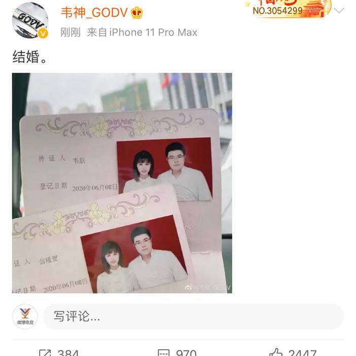 绝地求生职业选手GodV在微博宣布了结婚的喜讯!#韦神结婚#
