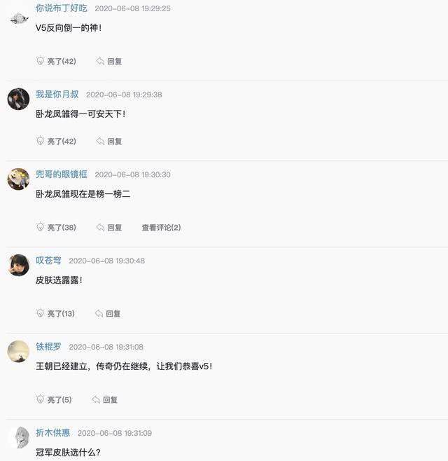 赛后网友们对于本次的比赛也是议论纷纷,有网友表示“V5反向倒一的神,卧龙凤雏得一可安天下,王朝已经建立,传奇仍在继续,让我们恭喜V5,V5:我已经在选s10的皮肤了,s10全球总决赛主题曲《威武》!”