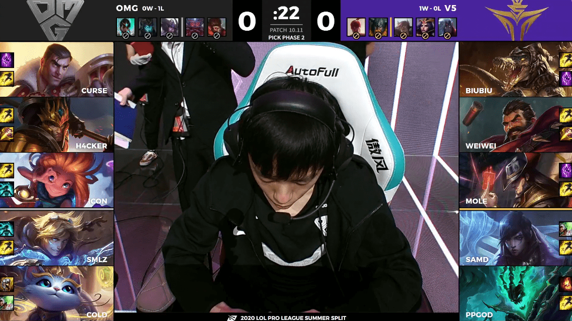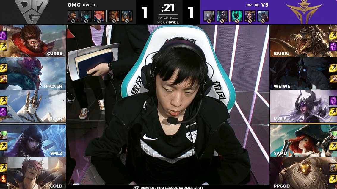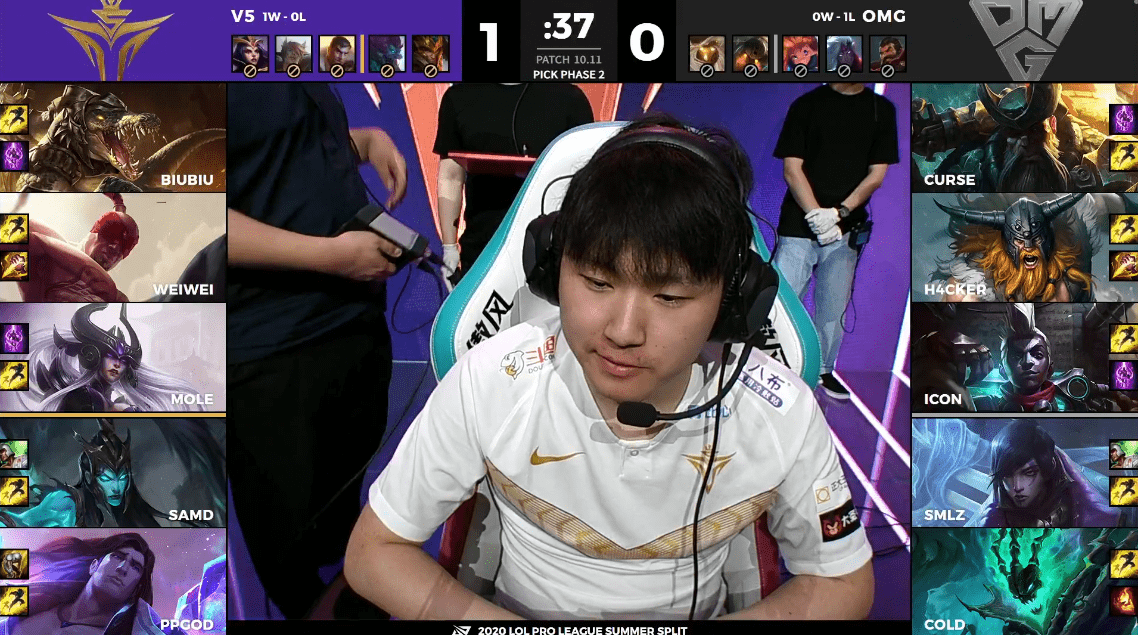 双方进入决胜局,从阵容上来看,OMG依旧是拿出了一套偏中后期的阵容,而V5则是拿出了一套多核的输出阵容。