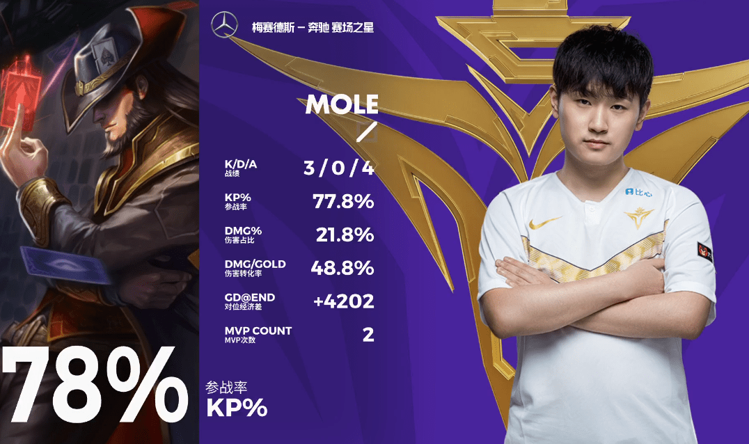 而不得不说的是,V5战队在取得优势之后表现也是相当出色,在完美运营的同时也是没有给到OMG任何可以翻盘的机会。最终,在第四条小龙争夺的时候,OMG率先“发难”想要抓掉V5的打野男枪,但因为过于深入反倒是被V5抓到了反打的机会,V5完成了一波漂亮的0换2顺利拿下小龙。并且因为在小龙团的时候成功“击杀”掉了OMG的上野,V5顺利拿下了大龙并一波拿下了OMG。而这一场比赛的MVP也是给到了在前期利用大招帮助V5顺利滚起雪球的中单选手Mole。