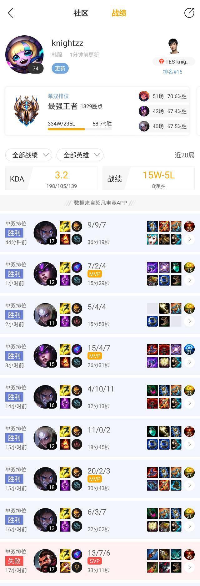 这边单独聚焦一下TES的中单Knight,Knight近期的状态相当恐怖,一路8连胜冲到了韩服第15,其使用的英雄也都是LPL正赛中不常见的塞拉斯和皎月。与先前Rank每局必换一次英雄的Knight不同,最近的Knight看得出来在铆足了劲上分了,考虑到Knight最近最常使用的英雄辛德拉遭到了较大削弱,且常规容易上Ban位,皎月和塞拉斯很有可能成为Knight新的秘密武器,在中路被BP针对的时候登场。