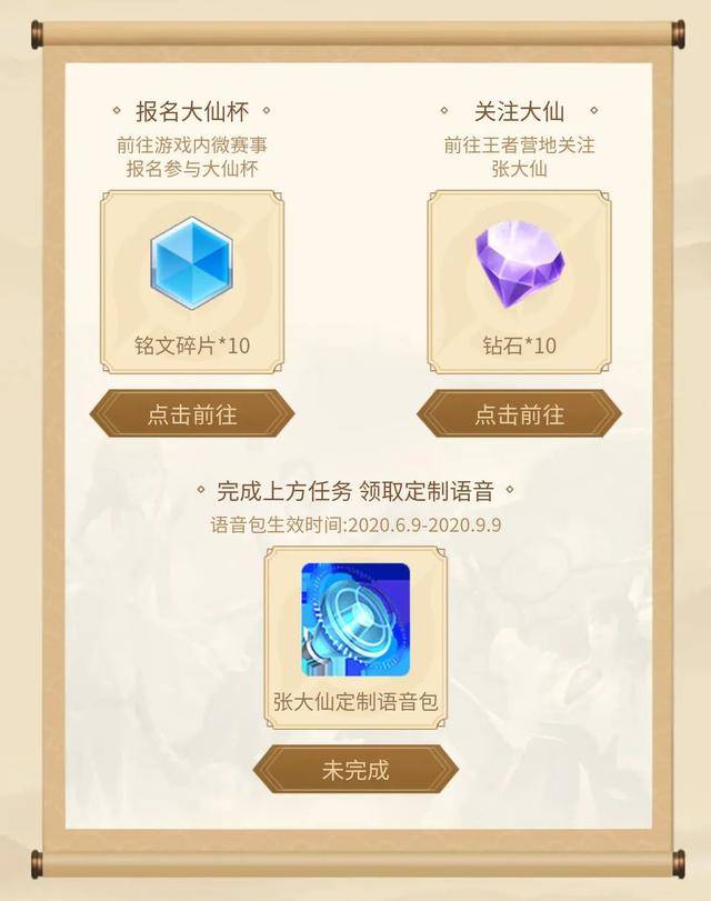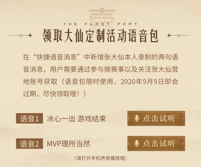 当时感觉挺有趣的,就想如何获取,但是似乎活动没有开启。直到今天,活动才正式开启。活动时间是6月9日至6月22日。那要如何才能获取呢?只需要两步便可完成任务,领取张大仙定制语音包。