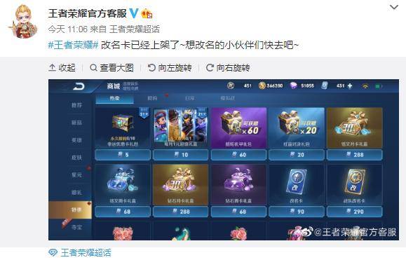 虽然这个定制的语音包是限时使用的,时间是6月9日至9月9日。但确实挺不错的。基本你不是大仙的粉丝,换上这个语音包感觉也挺有意思的。语音可以提前试听,不喜欢再选择不参与也可以。另外,有玩家反应前段时间王者荣耀里面的道具改名卡突然下架了。而背包里的改名卡也无法使用了。难道是王者荣耀要放弃改名这个功能了?但风波没几天,老亚瑟今天就来发布新消息了。改名卡重新上线,改名功能未受影响。或许之前是因为一些BUG才导致的无法改名。