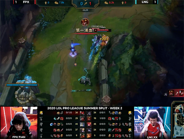 比赛来到5分钟,皇子来到上路配合塞拉斯击杀掉压线的猴子,皇子拿下一血。6分钟,男枪反掉LNG蓝区三狼和蛤蟆。6分钟,厄斐琉斯在下路线上换掉泰坦(男枪来到下路配合己方双人组抓LNG双人组,但是LNG双人组战力很强,最终厄斐琉斯闪现换掉残血泰坦)。8分钟,皇子拿下第一条峡谷先锋(FPX选择放掉)。9分钟,皇子在下路放出峡谷先锋撞掉FPX下路一塔两层镀层,随后皇子拿下己方第一条小龙(土龙)。