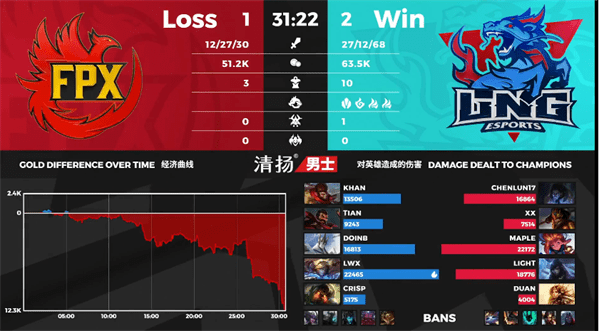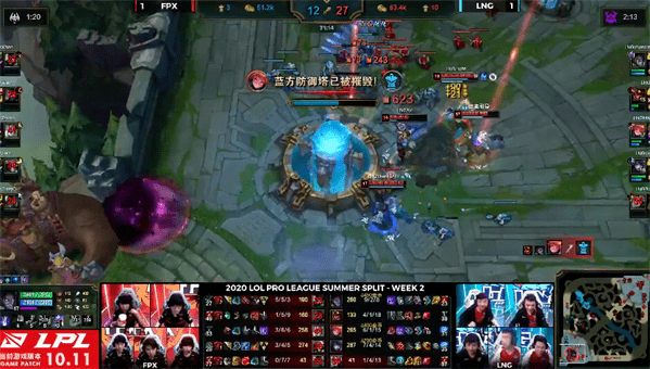 比赛来到30分钟,双方在FPX蓝区处发生5V5团战(FPX主动先手,但是双方装备差距太大了,而且厄斐琉斯输出无人限制,FPX直接溃败),最终LNG1换5FPX,随后LNG推掉FPX基地,赢下比赛胜利,拿到夏季赛首胜!值得一提的是FPX在S10赛季春季赛的前半段状态也非常不好(遭遇两连败),希望FPX早日找回状态!