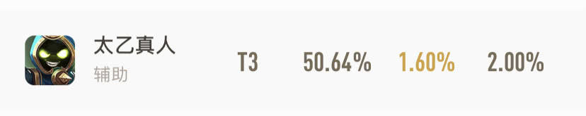太乙真人在路人局是一个名副其实的冷门英雄,登场率仅仅只有1.6%,排在辅助的倒数第二,造成这样的原因在于他是一个对配合要求极高的英雄,大招放得好发挥出来的作用远远大于1+1=2,反之就惨不忍睹,但这并不影响太乙真人加孙尚香的套路,在会玩的小伙伴们手中,这套组合是王者峡谷的神。