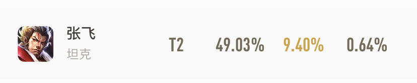 张飞的强度一直在线,现如今之所以登场率不太高,只有9.4%,根本原因还是他是一个保人的辅助,在开团上只能吼个大招,不太灵活,不太适应当前版本,但当他加上蒙犽后,效果就暴增,相当于给蒙犽这个露天炮台增加了一层厚厚的城墙,想要击杀蒙犽变得异常困难,也是一套非常流行的组合。