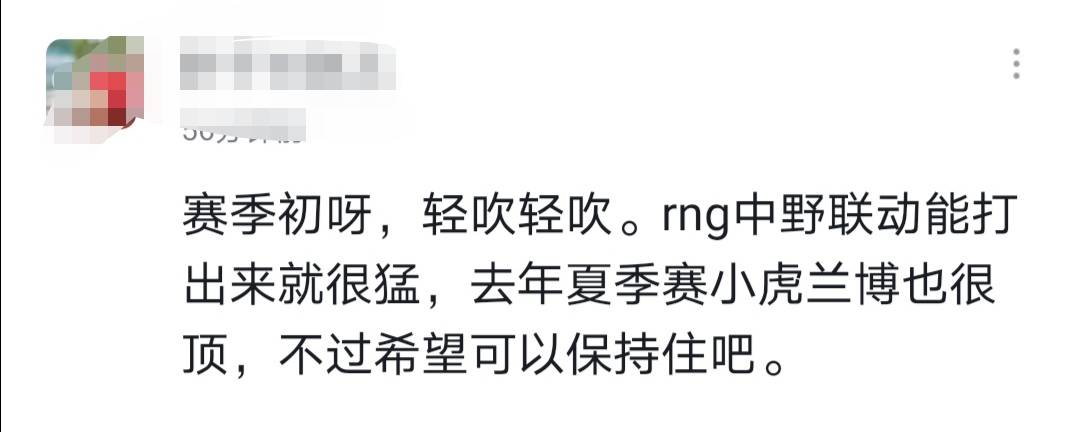 赛季初呀,轻吹轻吹。RNG中野联动能打出来就很猛,去年夏季赛小虎兰博也很顶,不过希望可以保持住吧。