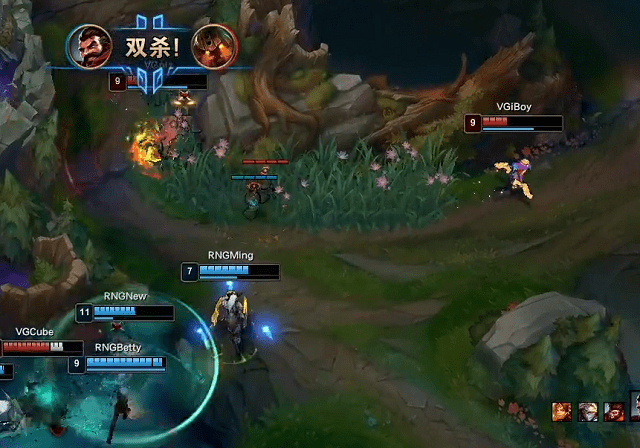 而在15分钟左右的峡谷先锋争夺爆发的团战中,小虎的阿卡丽因为发育的比较好,只身一个人便分散掉了VG的阵容,让VG的前排和后排彻底脱节。iboy在面对这样的阿卡丽突脸时也是非常的无奈,大招都没有机会交只能反身逃走保命。
