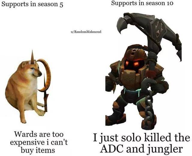 有网友在这条推特下面回复了另一张图,以前的辅助可怜巴巴地说眼太贵了,如今的辅助昂首挺胸地说我刚单杀了个ADC和打野!