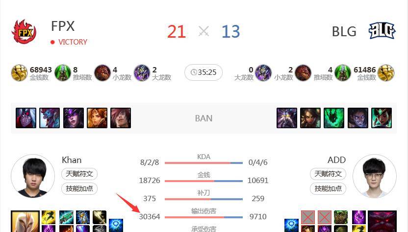 但其实看过这两场比赛的网友都知道,FPX赢得并没有表明上那么轻松。特别是在第二局比赛中,LNG的领先一度达到了4000之多,最后硬是Khan再一次凭借36.2%输出占比、8035的对位经济领先,以“一柱擎天”式的爆炸输出临危救主,FPX方才堪堪涉险过关。