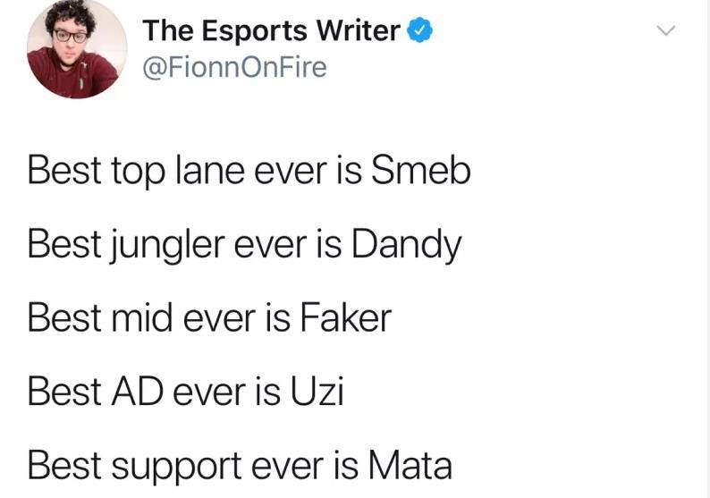 ESPN的排名如下图所示,史上最强上单给到了Smeb,最强打野给到了Dandy,最强中单毫无疑问是Faker,最强AD给到了UZI,最强辅助给到了mata。五个位置中只有UZI一人是LPL选手,而且是国产选手,其他位置基本上都是韩援。