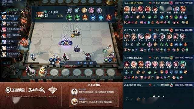 开局三家禁用蜀国阵容,三家禁用稷下阵容。1回合,武汉eStar.易老湿拿到两星刘备。8回合,武汉eStar.易老师满血六连胜。12回合,NMG.二师兄七连败,血量降至50点。16回合,XROCK.水长东五连败,血量降至26点。18回合,YTG.曹老大八连败,血量降至16点。22回合,XROCK.水长东第八名被淘汰。23回合,YTG.曹老大第七名被淘汰。GK.小黄第六名被淘汰。26回合,武汉eStar.易老湿刷出三星铠,仍然第四名被淘汰。31回合,RNGM.俊仔第三名被淘汰。QST.7D第二名被淘汰。NMG.二师兄意外事故换来QST.7D三星宫本,一波同时抬走两名对手,成功登顶。