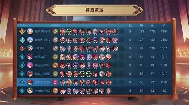 开局三家选手禁用尧天阵容,两家选手禁用蜀国阵容。5回合,RNGM.灭神、武汉eStar.周冬冬拿到蜀国令。6回合,YTG.安然四连败。11回合,RNGM.灭神满血八连胜。13回合,QST.堕城五连败,血量降至51点。16回合,GK.追风六连败,血量降至20点。19回合,RNGM.灭神满血十五连胜。21回合,GK.追风第八名被淘汰。22回合,QST.堕城第七名被淘汰。武汉eStar.周冬冬第六名被淘汰。23回合,RNGM.灭神十八连胜被断。24回合,上海EDGM.牙膏第五名被淘汰。27回合,YTG.安然第四名被淘汰。28回合,NMG.小浪晨.第三名被淘汰。31回合,RNGM.灭神七连败,血量降至2点。32回合,RNGM.灭神神装吕布超常发挥,完成绝地翻盘!