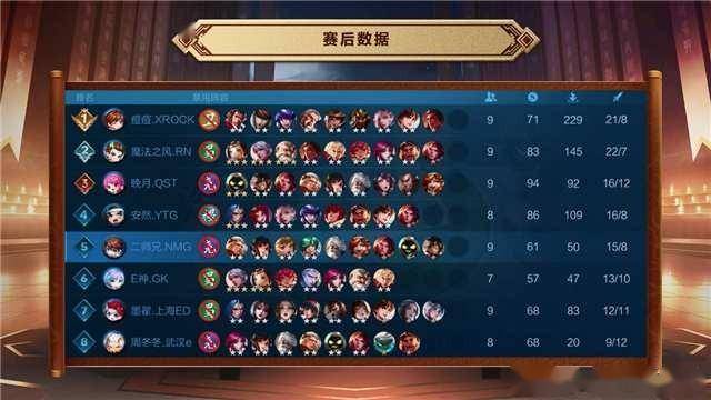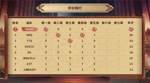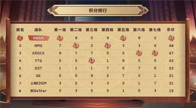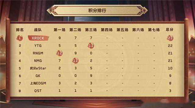 开局三家禁用蜀国阵容,三家禁用尧天阵容。9回合,上海EDGM.墨翟六连败,血量降至66点。13回合,YTG.安然三连胜,72滴血暂列第一。17回合,GK.E神四连败,血量降至35点。 21回合,武汉eStar.周冬冬第八名被淘汰。22回合,上海EDGM.墨翟第七名被淘汰。GK.E神第六名被淘汰。23回合,NMG.二师兄第五名被淘汰。YTG.安然第四名被淘汰。28回合,QST.晚月第三名被淘汰。29回合,XROCK.痘痘九蜀李白决战狂秀,两发大招帮助队伍稳定推进,一波成功登顶。