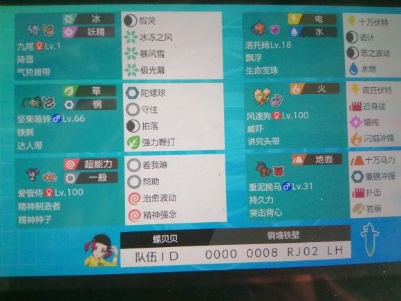 其实我原来的草钢是铁壁扑击的,但是这个队伍大部分成员都比较害怕洗衣机这个精灵。特别是诡计起来的那种,于是这里选择了一个达人带的三攻一守的草钢。因为必须要快速的清除对方水盾对重泥挽马的威胁!达人带的陀螺球和拍落打飞机多龙仙布伤害非常足。是配合重泥挽马的一个重要打手,在极光幕下的耐久也是相当可怕