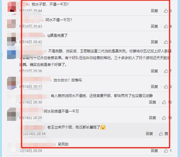 直到现在依然有很多粉丝不理解IG老板王思聪将JKL交易的事情,放走一个如此年轻且如此优秀的AD选手看起来并不是一件明智之举。在6月13日晚上的比赛结束后,王思聪的微博遭到大量网友的疯狂爆破,纷纷表示:阿水不值1000W?放水放水把IG毁了!目前王思聪也没有明确开始对线,当时声称支持JKL交易的网友也没有声音。如今阿水操作如此亮眼,表现如此出色,就算是王校长也没法反驳了吧?