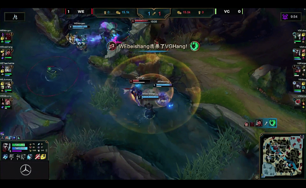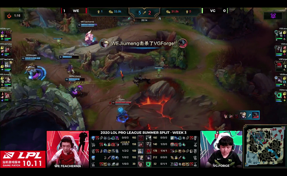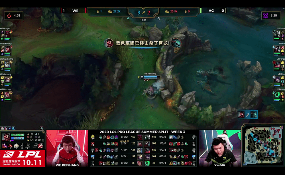 [10:00] WE开打峡谷先锋,VG试图阻止,但被腕豪开到,WE打出零换二后拿下峡谷先锋。随后VG拿下第一条小龙,属性风。