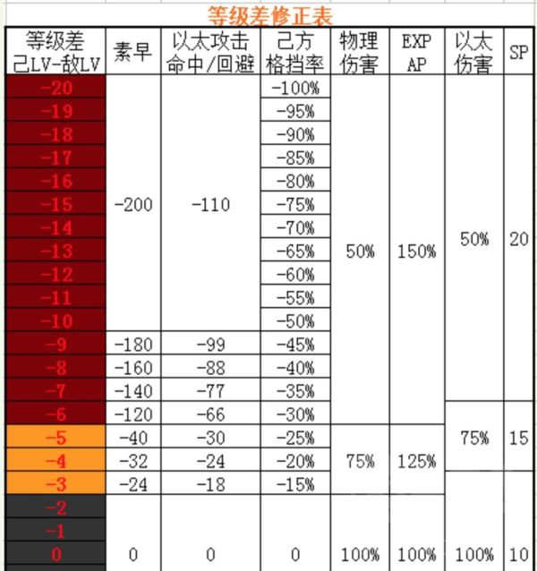 当等级差值在5级时敏捷修正-40,差值在6级时修正为-120,是一个非常大的分水岭。等级差值大于10级后,修正值达到最大值-200。