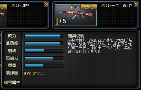 从AK47-十二生肖-蛇的枪械介绍来看,这把AK则是守到“守护大地的十二神将之蛇”的守护,其实也就是十二生肖啦。应该和其他的皮肤枪一样,没有什么特殊的属性加成,但是真的足够漂亮。