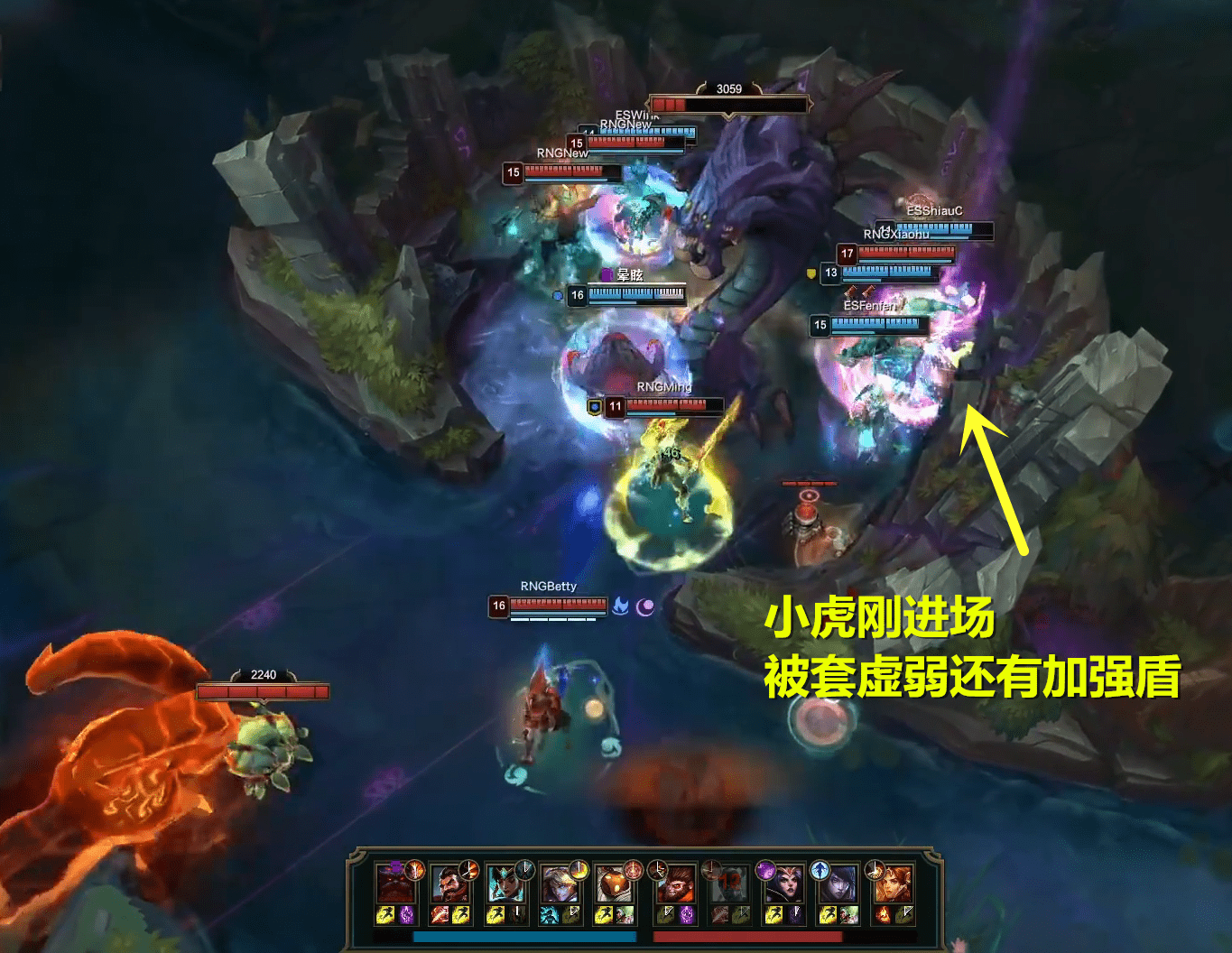 看到这大家应该明白为什么Rookie的妖姬天秀,而小虎的就不行了,原因就在阵容,玩过卡尔玛的玩家应该知道,当卡尔玛的法强上来之后,他的RE技能加强盾有多么厚,妖姬就算是打出完美技能连招也不可能秒掉一个被卡尔玛保护的C位。