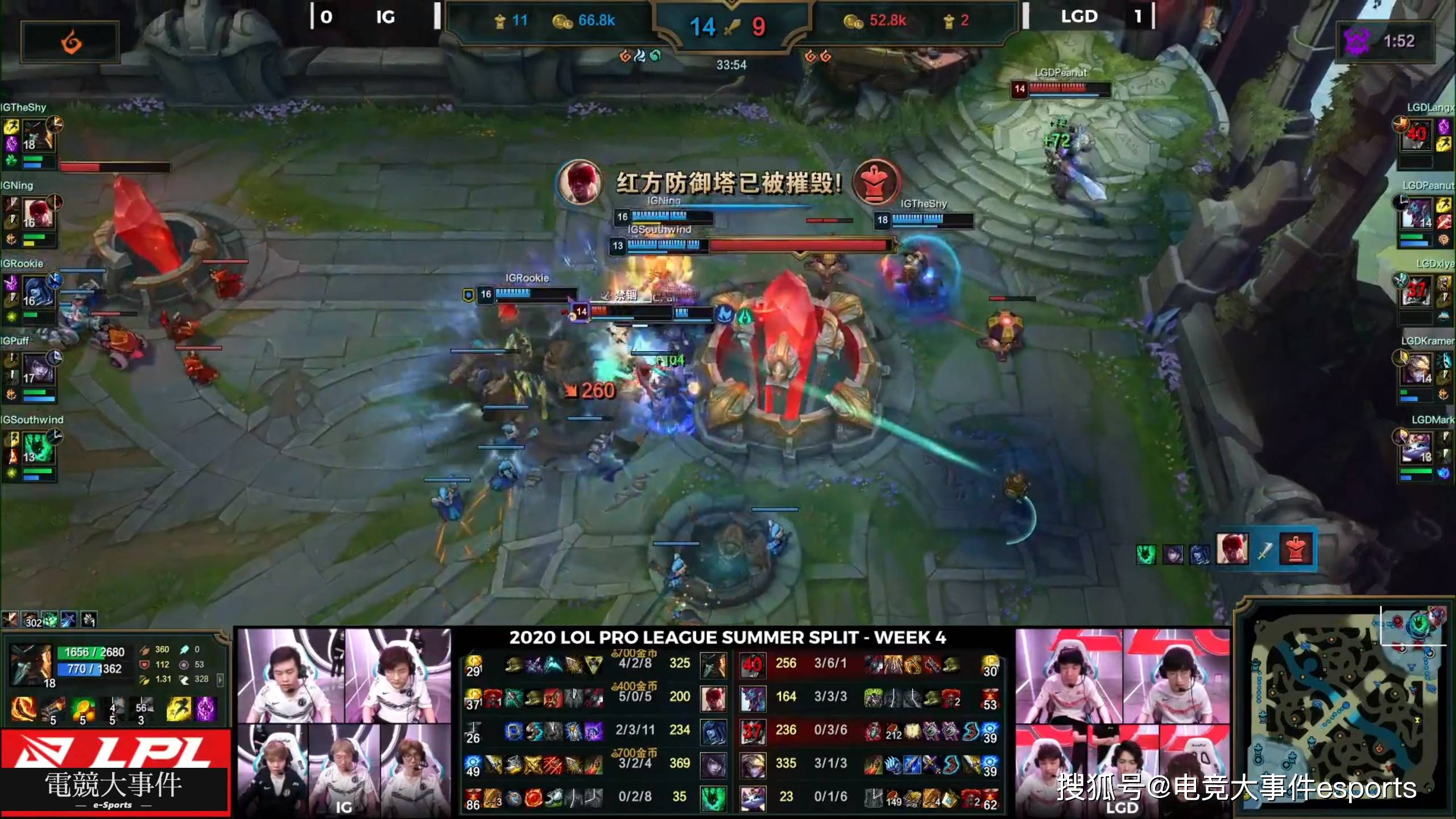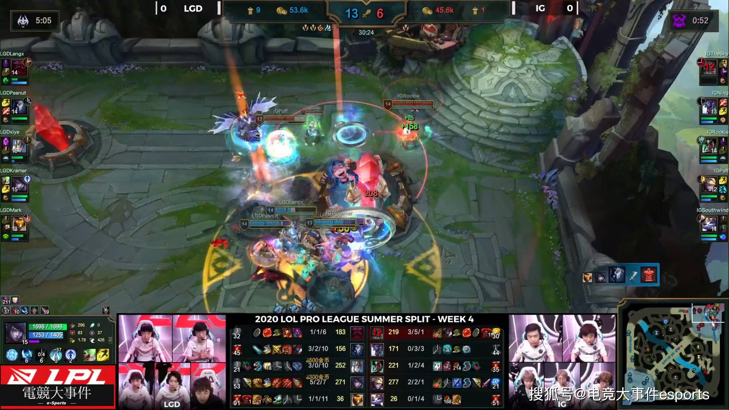 小花生前期节奏很炸,先后在中上两路击杀了rookie和theshy,但是theshy利用这段期间也是控下了两条小龙,之后双方其实在地图经济上咬得比较死,虽然狼行在上路单杀了theshy一次,但是之后受到了iG的疯狂针对,导致了自己的发育很差,所以中期没法站出来打伤害。