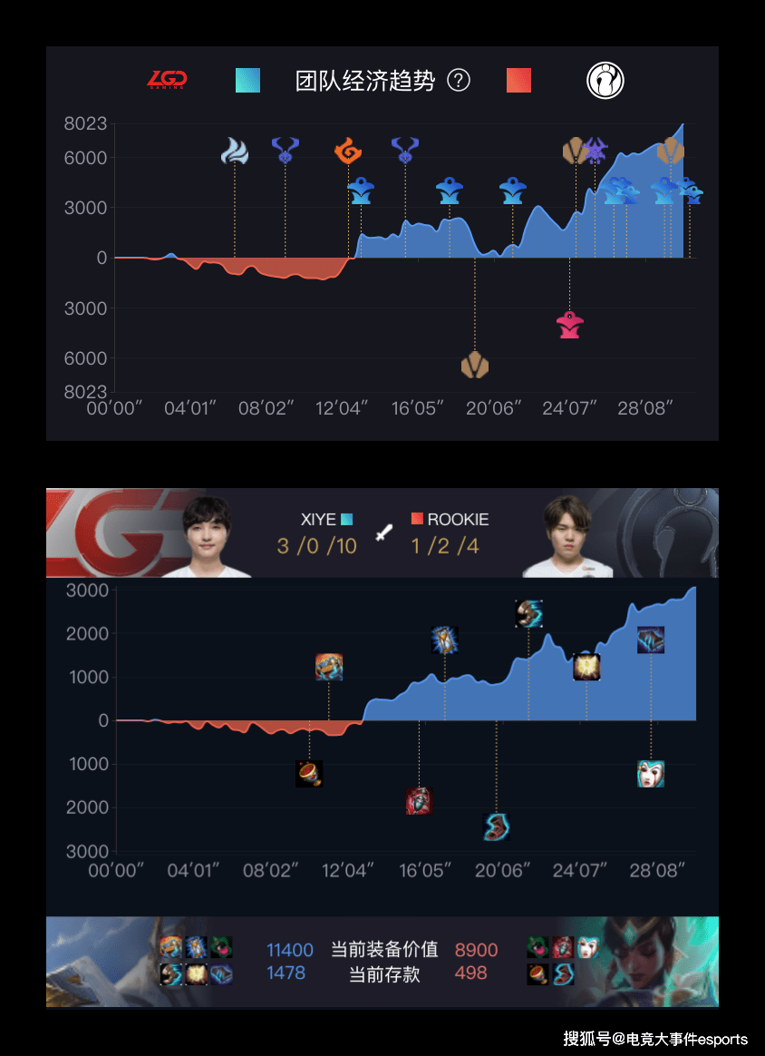 从赛后数据来看,前期iG一直没有在对线期将经济拉开,在第三条小龙之后,LGD通过中期的大乱斗收获了大龙的经济,在拿下大龙后,这一局iG想翻已经很难了。同时在中单这个位置上,5BAN中单也让rookie的英雄选择很难了。