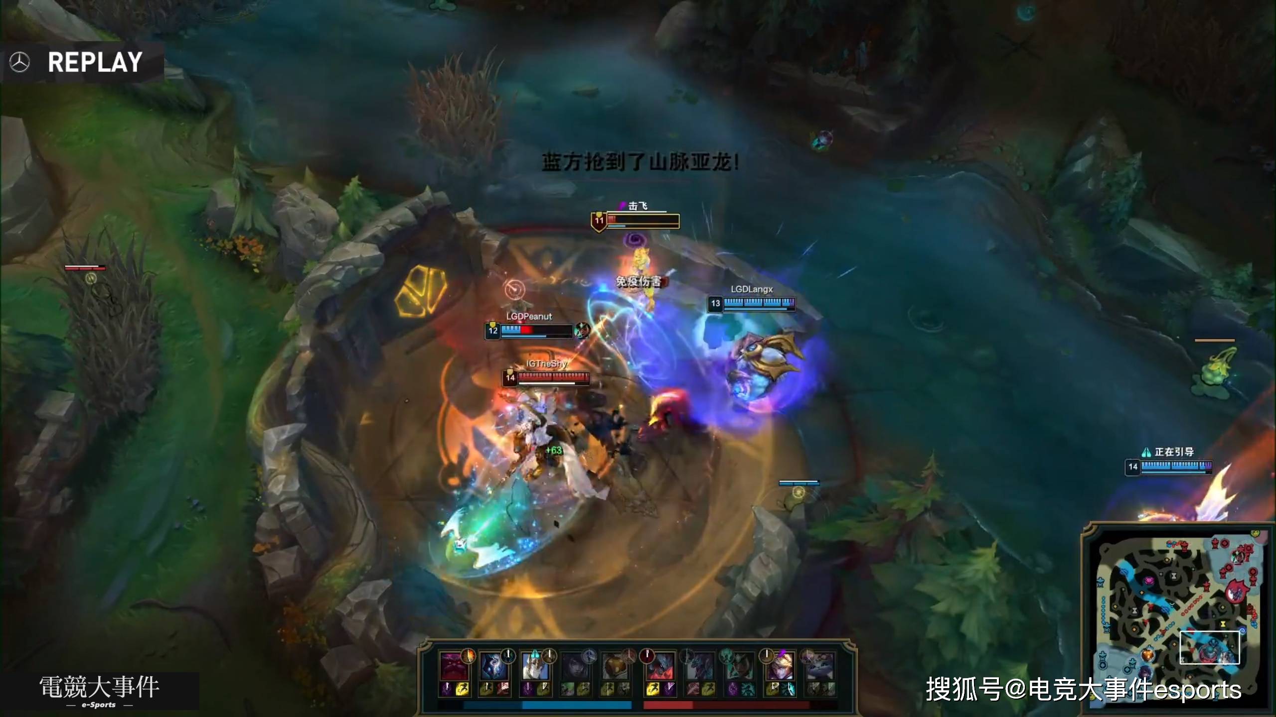 中期双方就陷入了各种极限大乱斗,但是随着小花生抢下了第四条小龙开始听牌后,还击杀了theshy,随后LGD果断rush拿下大龙。