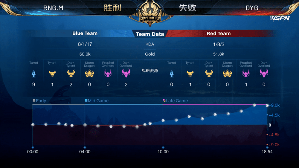 双方平稳开局,1分58秒RNG.M下路团战RNG.M打出1换2。2分47秒DYG拿下暴君。4分18秒DYG拿下先知主宰。5分16秒RNG.M摧毁敌方下路外塔。6分27秒RNG.M摧毁敌方上路外塔。8分40秒RNG.M上路打出0换2。9分29秒RNG.M摧毁敌方中路外塔。10分30秒中路团战RNG.M打出0换2。11分24秒RNG.M摧毁敌方下路二塔。12分54秒RNG.M拿下主宰。15分13秒RNG.M拿下黑暗暴君。15分47秒RNG.M姜子牙大闪击杀蔡文姬。16分05秒RNG.M摧毁敌方中路外塔。16分20秒RNG.M摧毁敌方下路高地塔。16分38秒上路团战RNG.M击杀盘古并摧毁敌方上路高地塔。18分55秒RNG.M强点水晶拿下比赛。