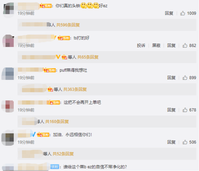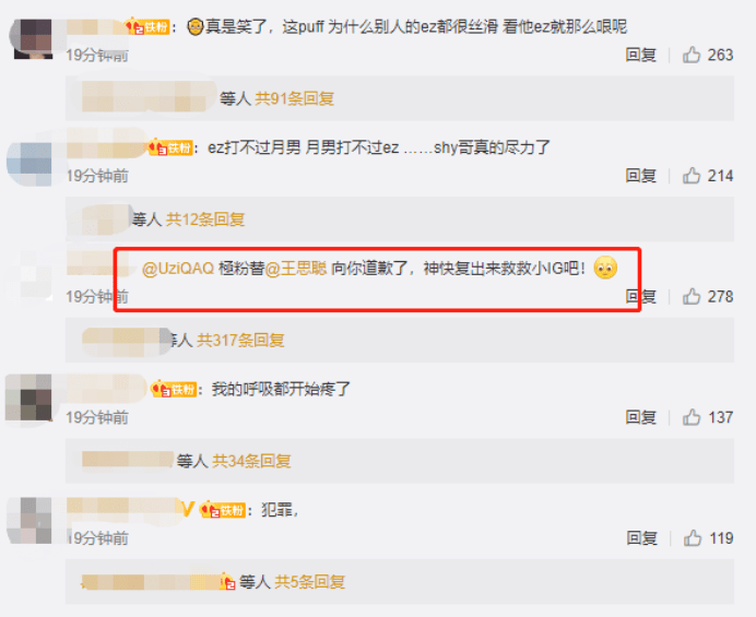 比赛失败后,IG的粉丝就开始分锅。说宁王的,说rookie的。当然了,更多的还是说puff的。在这几局的比赛中,IG的粉丝都表示puff的发挥有点离谱,两把EZ作用不大。网友纷纷表示,puff菜的我想吐,这把不会再开上单吧。甚至还有粉丝艾特了UZI,替UZI向王思聪道歉,让UZI复出来救救IG。
