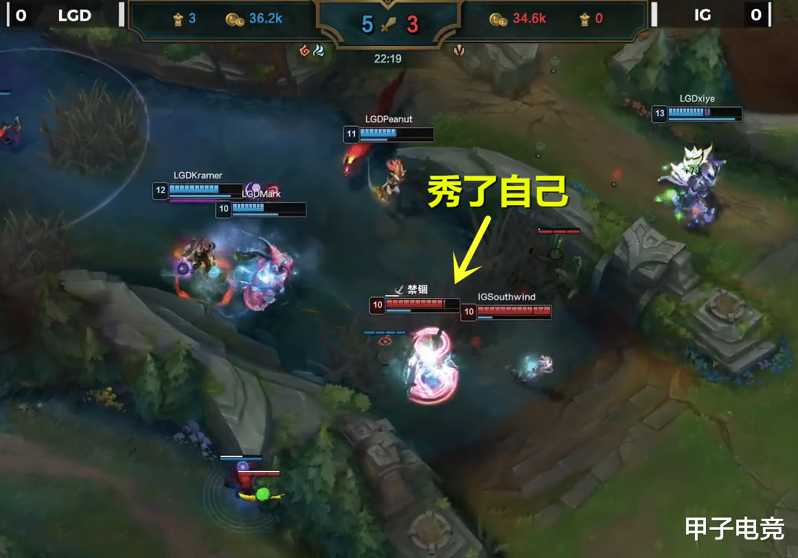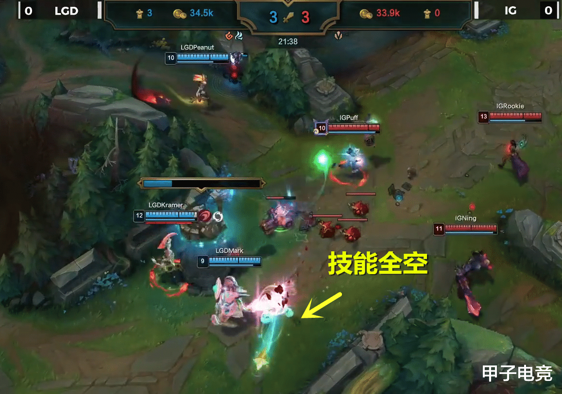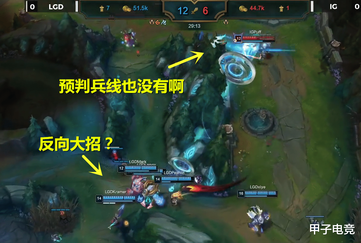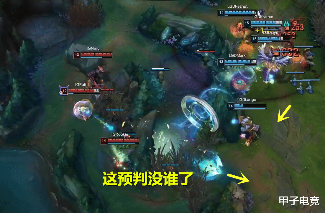 而更离谱的就是泡芙EZ的大招了,甲子发现泡芙的大招释放得很随意,一点都不知道珍惜大招,在后期的团战中,IG和LGD打了一波遭遇团战,而且还是在魔沼蛙附近的小地方打的团战。