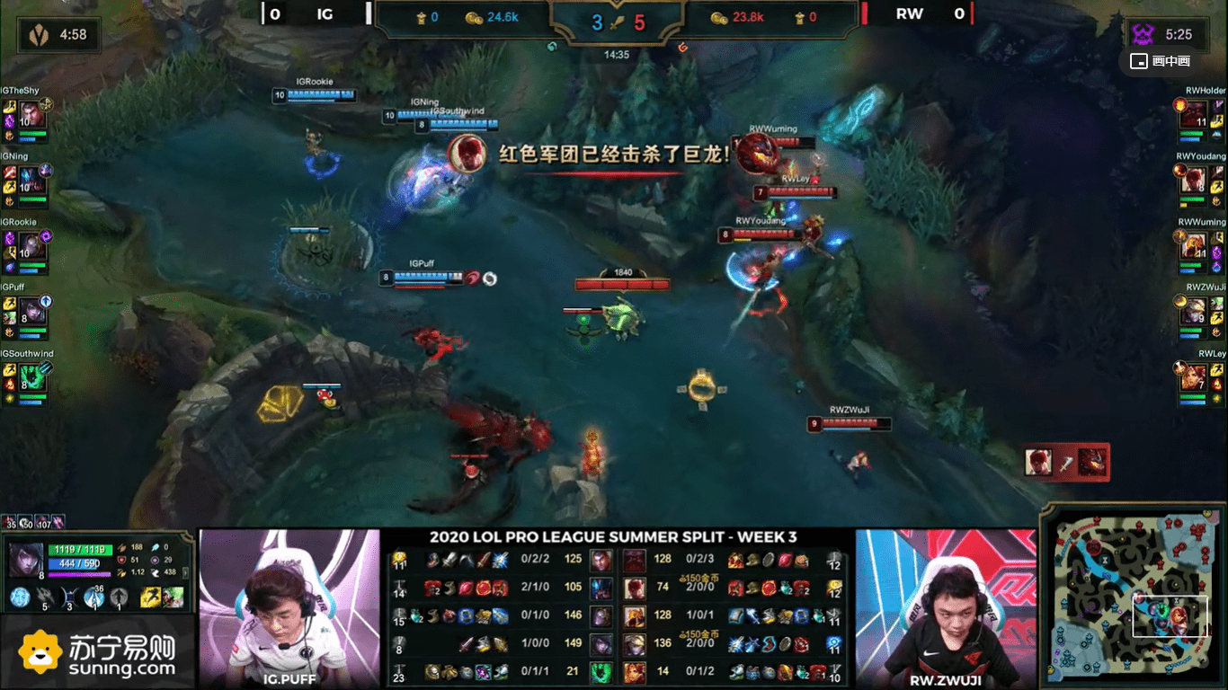 [14:35]RW集结控下火龙,IG趁势推掉中路一塔,奥恩也在上路推掉IG上路一塔。