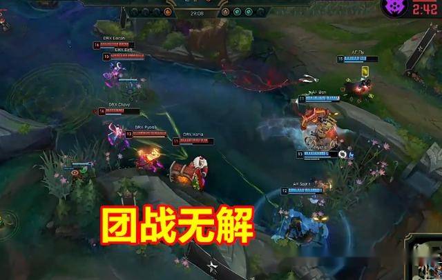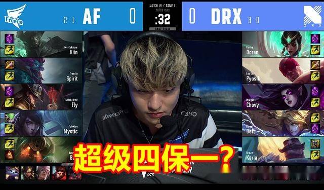 四保一EZ在之前就曾被RNG使用过,下场如何也不用过多赘述。但DRX战队这次选出的阵容是上单卡尔玛、中单莫甘娜、下路布隆搭配EZ,最终打野补出盲僧的''四保一阵容''。在前期DRX就打出了相当不错的节奏,让粉丝们为之眼前一亮。