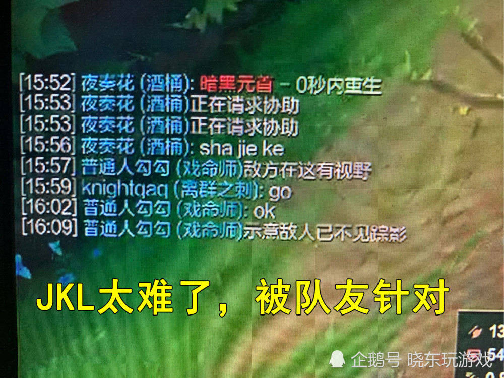 而JKL则是队内被“针对”的最惨的一个,卡萨表示“打JKL”,先“击杀”他15次再说,作为队内的“好队友”,还是去冲JKL,都是纷纷赞成,这也就导致了JKL的游戏变成了“黑屏”游戏,彩色屏幕JKL已经是看不到了,被队友针对的是非常的惨,上中野在卡萨的带领下,罕见地达成了一致,就是要追着JKL打,这里建议JKL先去“拔网线”,玉石俱焚点,丝毫不慌,这时候的Knight也是对JKL说:“你有点好杀啊”!