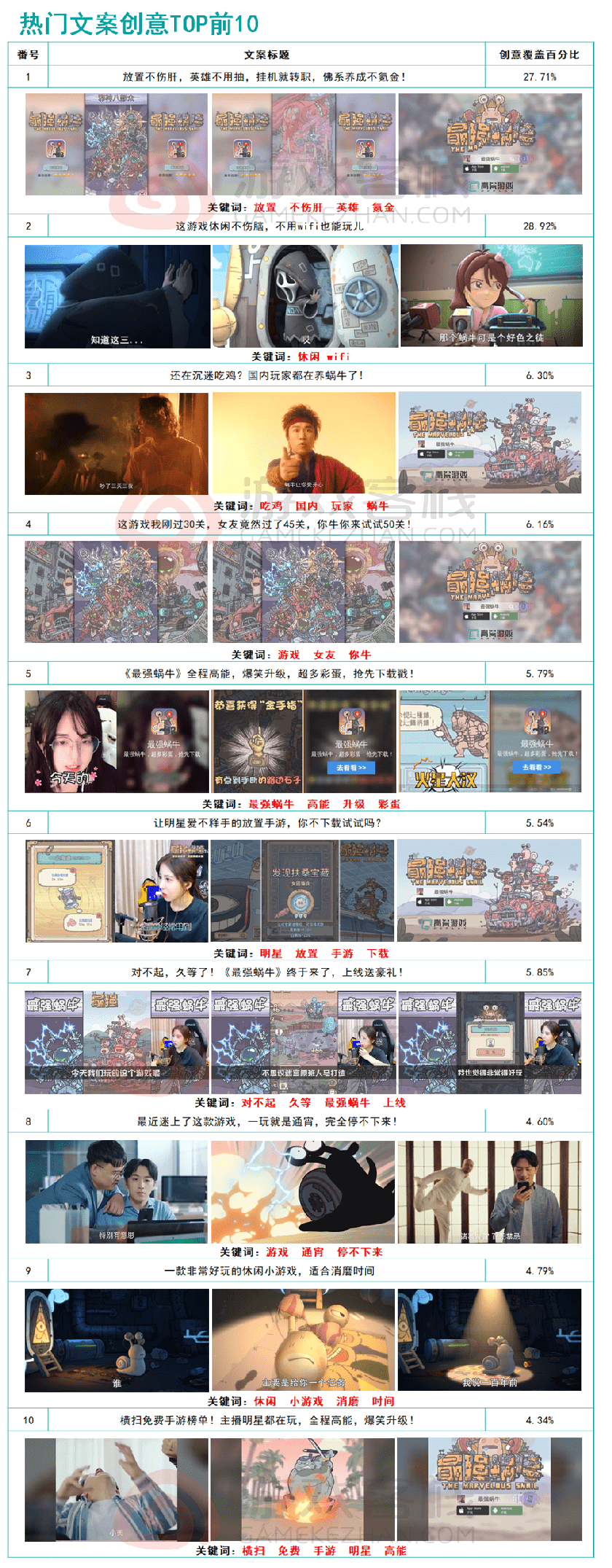 在近14天《最强蜗牛》仅投放的6794个落地页,其广告输出也是动画、游戏体验、游戏画面三大类。 在此之中宣传内容更注重广告标语的内容,这些广告词都比较接地气,能让玩家一目了然游戏的主要亮点到底有哪些,比如漂亮小姐姐都在玩、猛男也爱玩等内容。