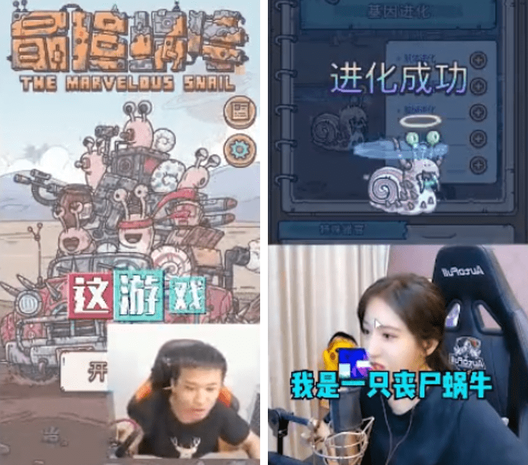 广告创意方面,《最强蜗牛》此次的创意输出主要为三个方面,其一以玩家的角度进行游戏体验说出游戏的亮点,其二制作相关动画进行角色宣传,其三投放游戏视频直观告诉玩家游戏的特色玩法。这三大类型的广告创意里,动画与玩家体验游戏的视频内容最为丰富。它们也更加吸引玩家的目光。比如将游戏画面与玩家体验结合的视频内容,玩家直播游戏过程早已是最为流行的游戏直播方式,以这样的方式告诉玩家游戏的特色有什么更能增加可信度。