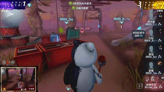 下半场:狼队监管者邦邦,上半场比赛XR被三跑,这把XR的求生者必须是3跑或者四跑了。开局出生往鬼屋组,看到是前锋,再去河道看到了祭祀的洞,穿洞过河,祭祀转终点站提前下板,祭祀绕过终点转回河道穿洞,到鬼屋二楼,先知给鸟,炸掉鸟,挨刀翻窗下楼。先知没鸟,邦邦转抓先知,先知倒地,前锋在附近,邦邦铺炸弹牵人,使前锋无法开球撞人,挂上先知,前锋直接撞救,救下来前锋在撞,成功让先知走祭祀大洞,成功断掉邦邦节奏。