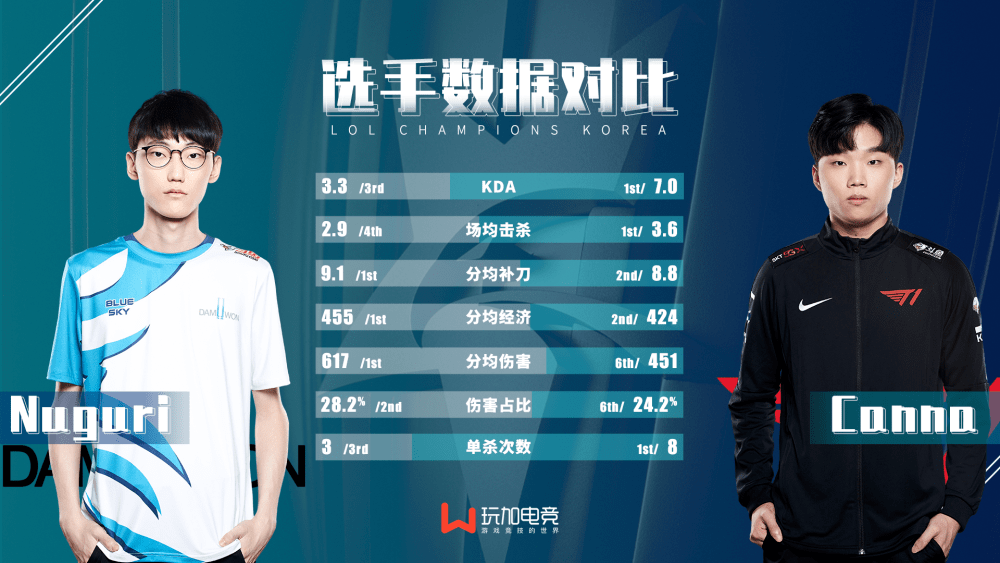 LCK被称为“盛产上单”的赛区,自S3至S9的世界冠军上单之位,更是无一例外全部由韩国人收入囊中。现今DWG的上单Nuguri与T1的上单Canna,作为新一代的上单代表都在赛场上为我们带来了不俗的表现,那在今天的比赛开始之前,先让我们来看看两位上单选手的各项数据对比吧。